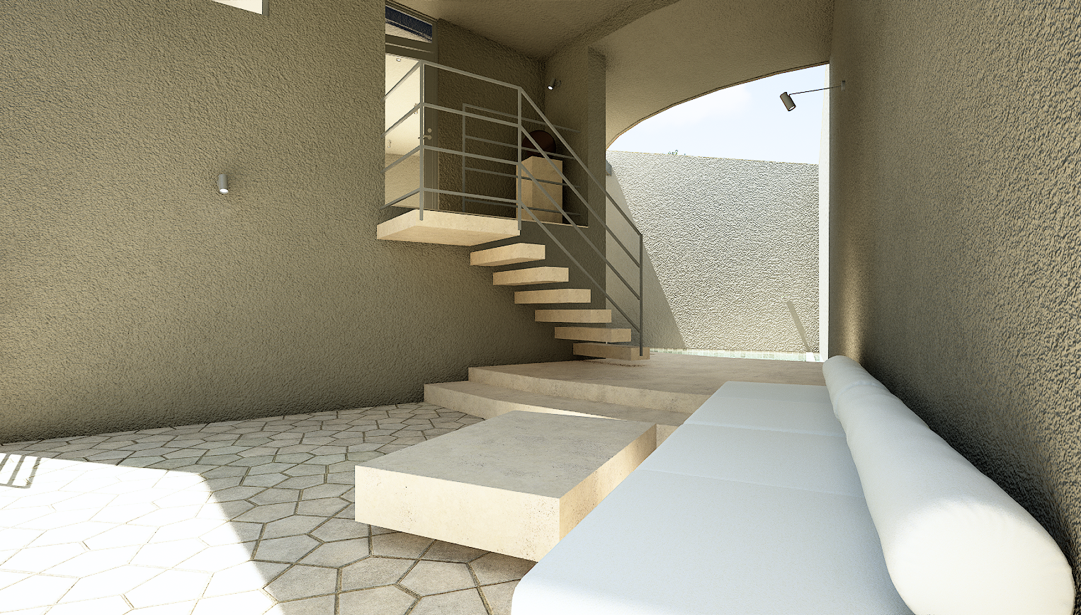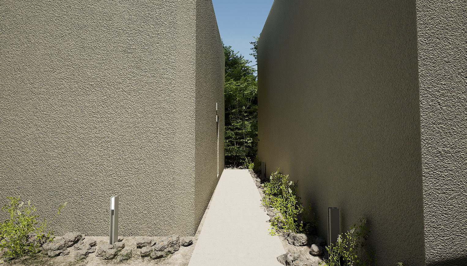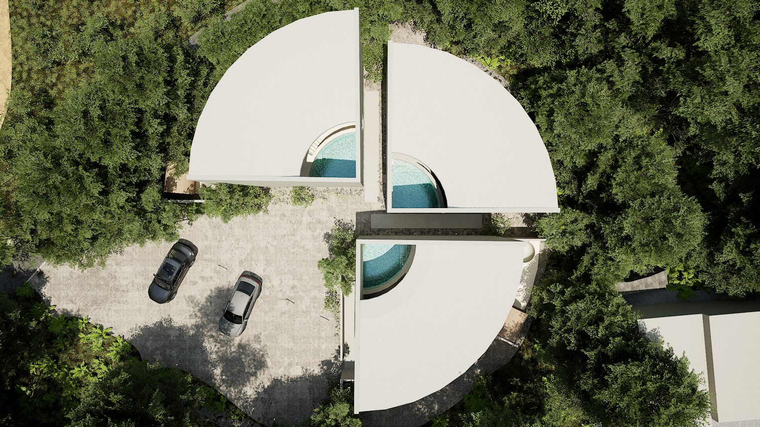 扇形の建物の外側にはフクギ、内側には空に抜けるプールを配置し、どこにいてもフクギと空が感じられ、プライバシーに配慮しつつ、枝葉が風で靡く音や雨音が壁で反響して、ここでしか感じられない五感を刺激する空間となっております。