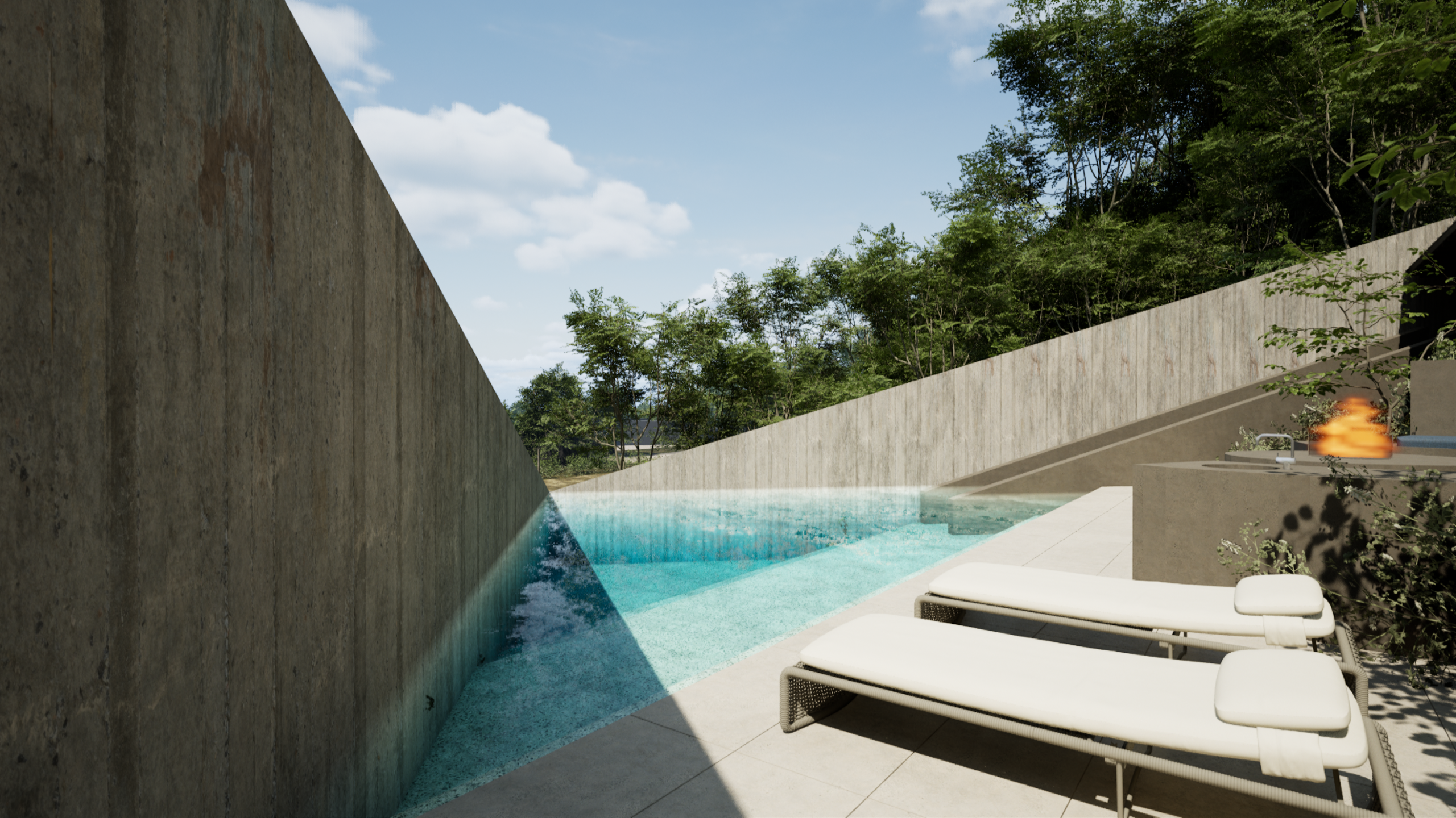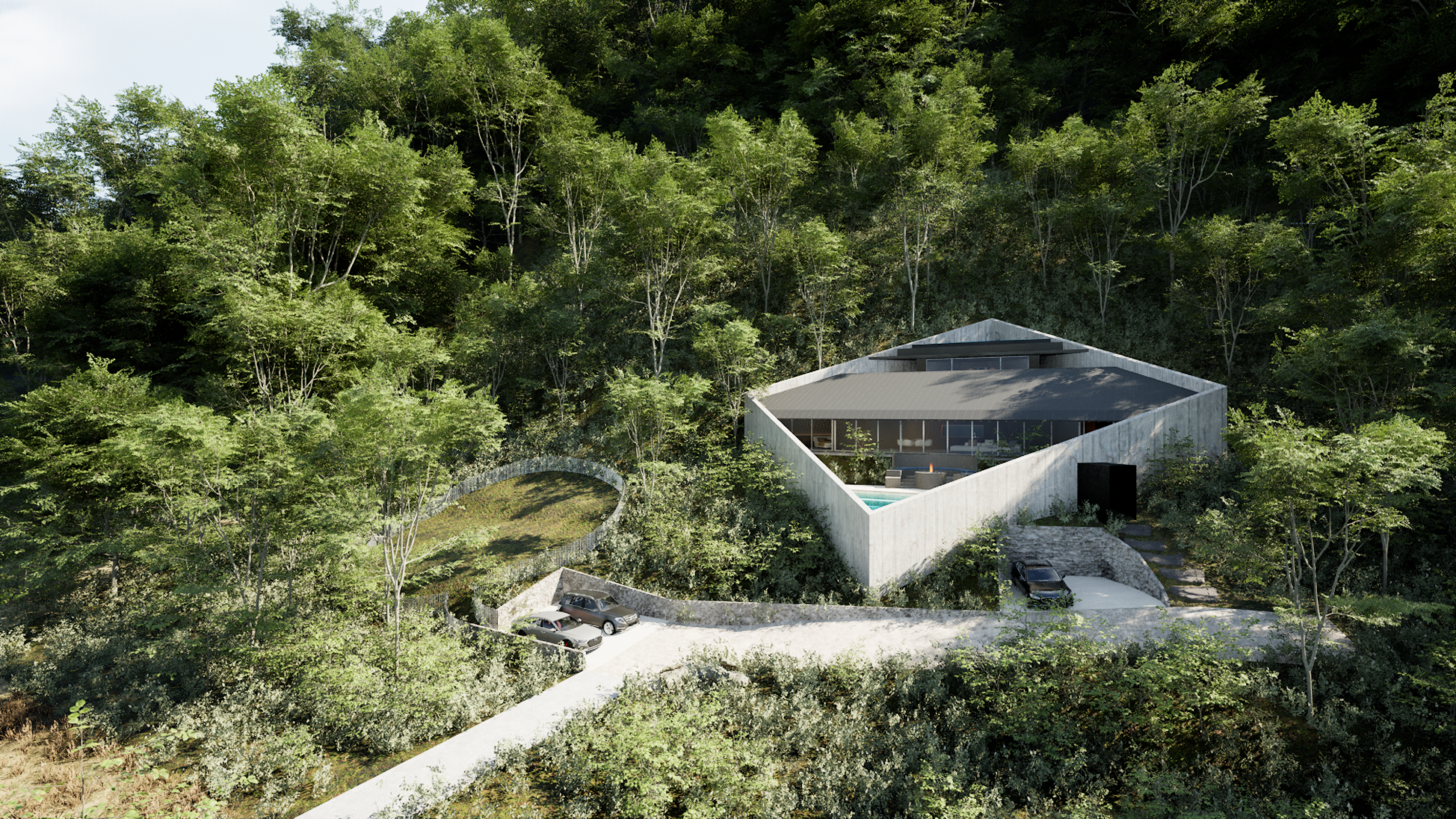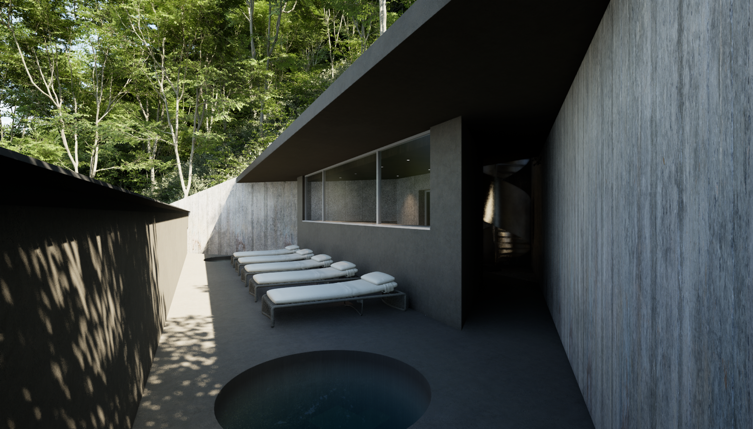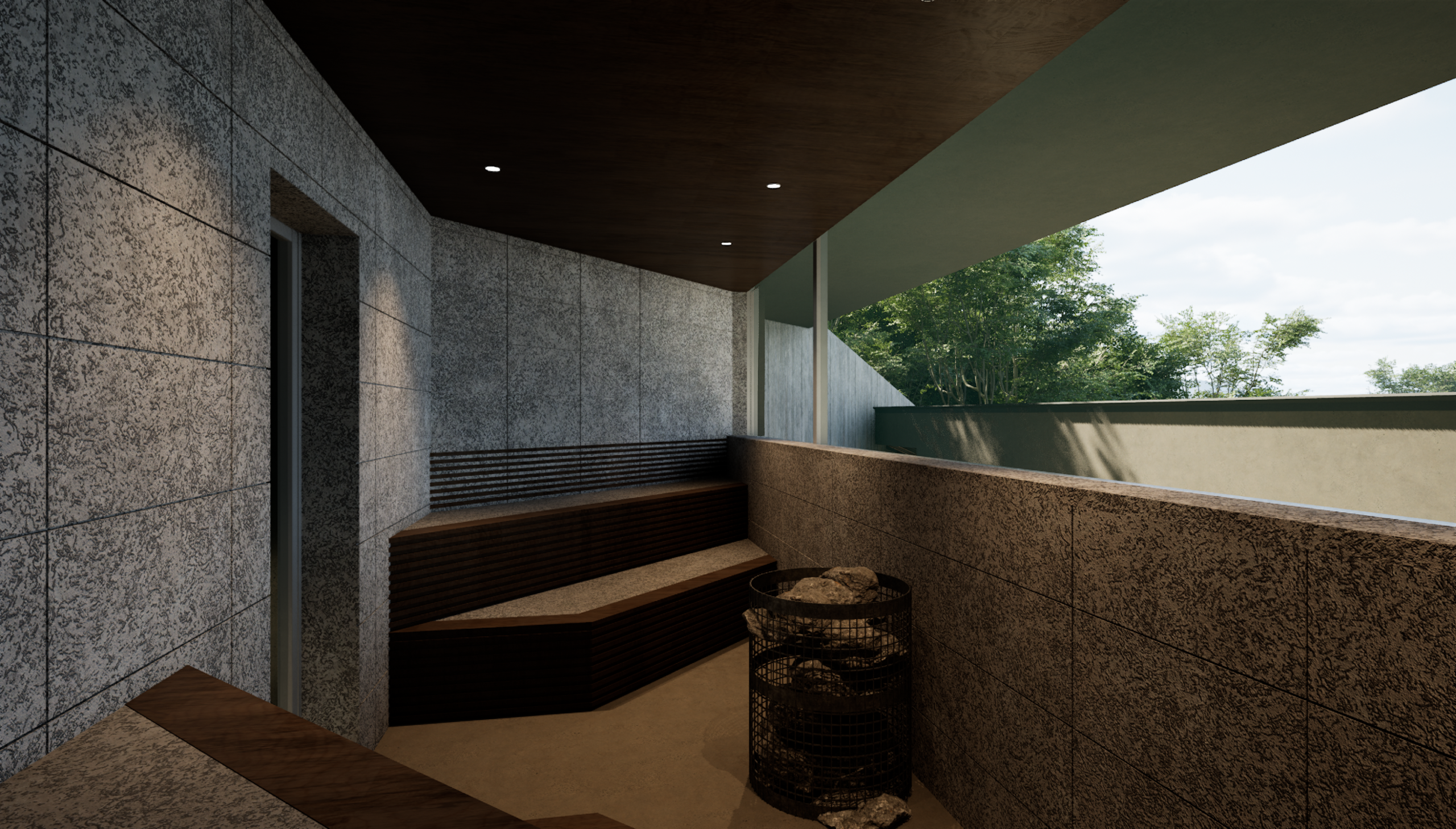 建物は段々状の断面を持つ平屋として構成しています。下段にプールとテラス、中段にLDKと二つのベッドルーム、上段にサウナと外気浴スペースを配置し、屋上には露天風呂を計画しました。段差は単なる条件ではなく、滞在のリズムをつくる装置です。夕陽が沈む時間に身体の感覚を取り戻し、自然に身を委ねながら静かにリセットされていきます。日本が本来持つ季節と風土の豊かさを、現代のリトリートとしてかたちにしました。