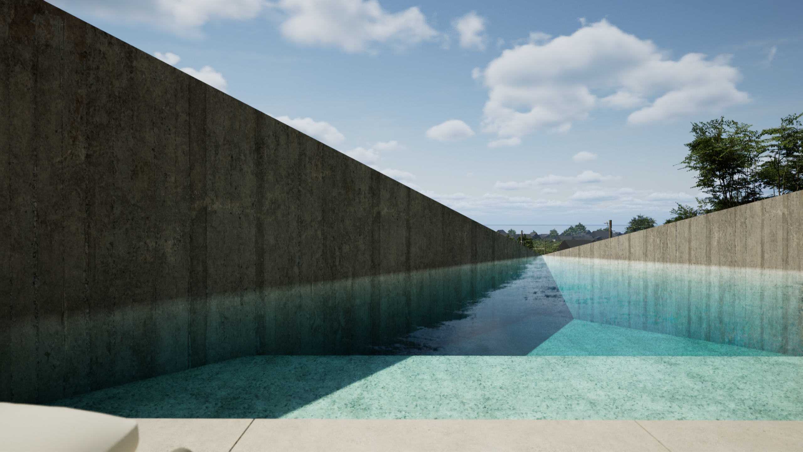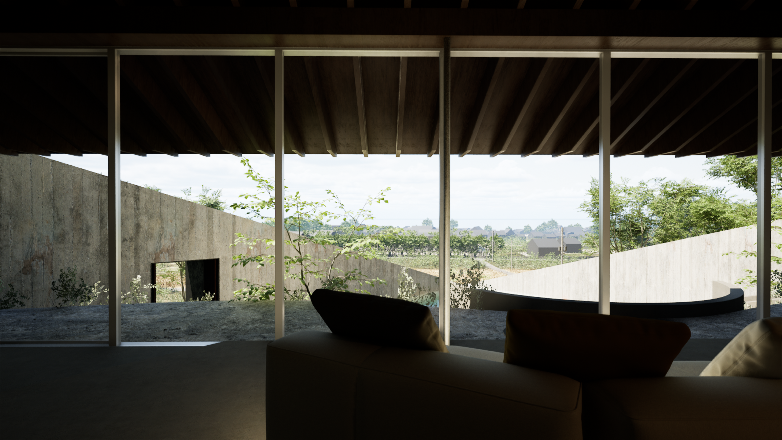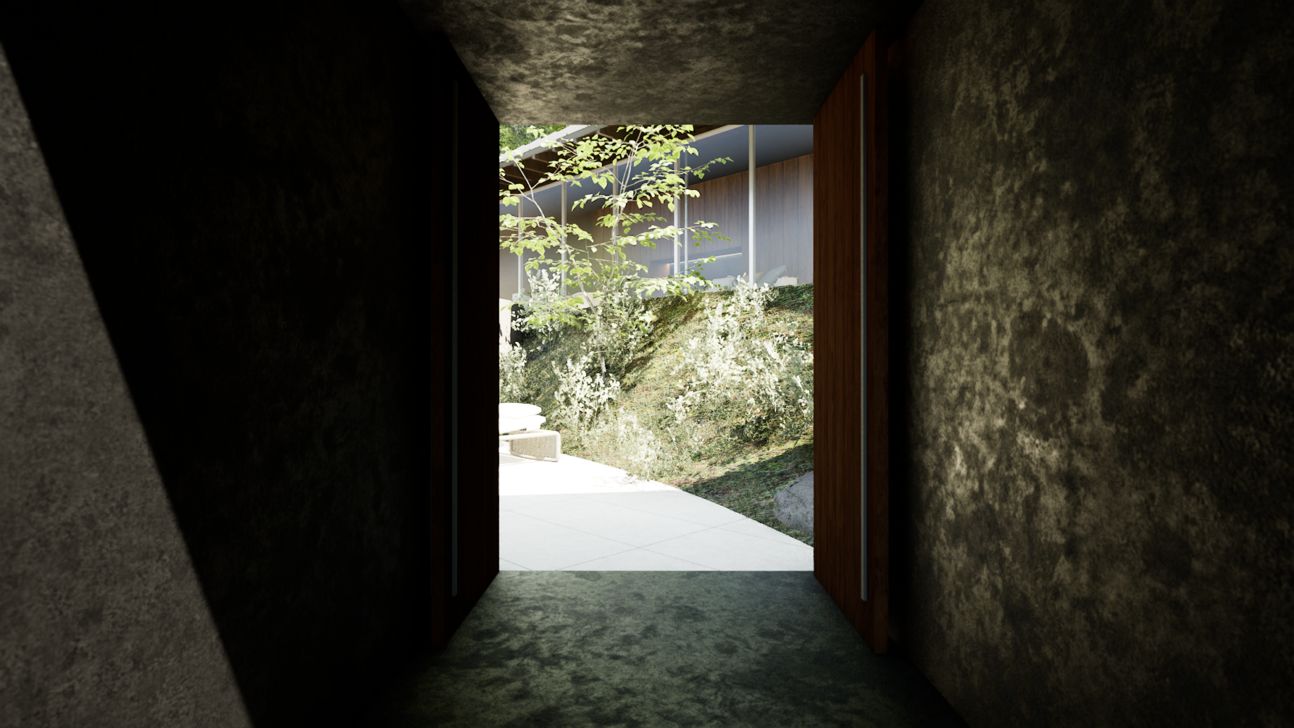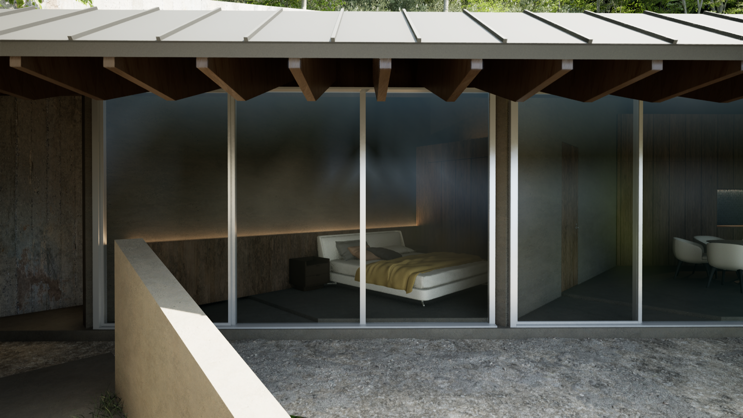 建物は段々状の断面を持つ平屋として構成しています。下段にプールとテラス、中段にLDKと二つのベッドルーム、上段にサウナと外気浴スペースを配置し、屋上には露天風呂を計画しました。段差は単なる条件ではなく、滞在のリズムをつくる装置です。夕陽が沈む時間に身体の感覚を取り戻し、自然に身を委ねながら静かにリセットされていきます。日本が本来持つ季節と風土の豊かさを、現代のリトリートとしてかたちにしました。