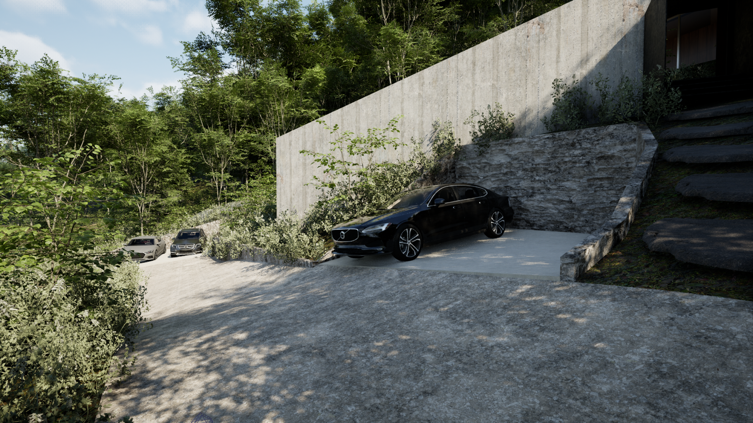 敷地は農作業の履歴を残す三段の雛壇状地形を成し、高さごとに異なる景色を持っています。造成して均すのではなく、この段差を居場所の多層性へ転化するために、三つの手法を設定しました。「囲む」ことで安全性と安心感を確保し、「段々形状を活用」することで土工事を抑え、建築と擁壁を一体的に計画しています。さらに「傾ける」ことで周辺からの視線を整えつつ、内部からの眺望を立ち上げ、この土地でしか成立しない姿を導きました。